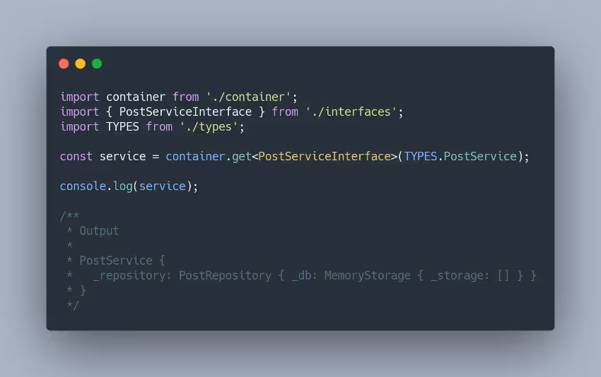 Finally, here we have a simple of example on how we can use our container. I’m getting the PostService using the identifier defined in types.ts .
