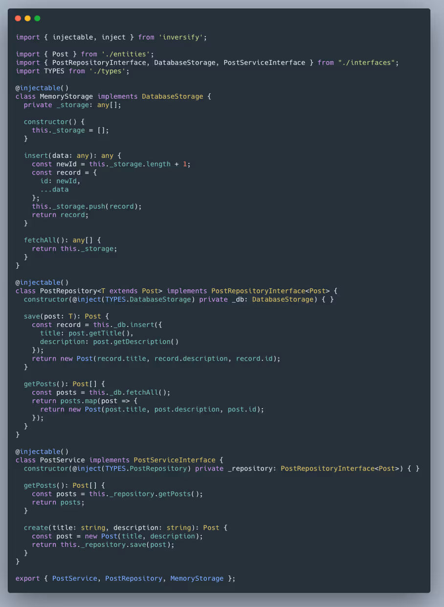 Now we implement our interfaces. As you can see, we’re using the injectable and inject decorators to annotate the classes we want to inject and injecting a dependency into a class, respectively.